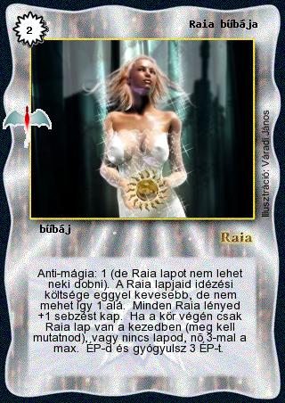 Kiadás: Sárkánymágia, Alappakli, 8. kiadás Gyakoriság: nem gyakori Lapszín (isten): Raia Típus: bűbáj Szöveg: Anti-mágia: 1 (de Raia lapot nem lehet neki dobni). A Raia lapjaid idézési költsége eggyel kevesebb, de nem mehet így 1 alá. Minden Raia lényed +1 sebzést kap. Ha a kör végén csak Raia lap van a kezedben (meg kell mutatnod), vagy nincs lapod, nő 3-mal a max. ÉP-d és gyógyulsz 3 ÉP-t. Illusztráció: Váradi János
